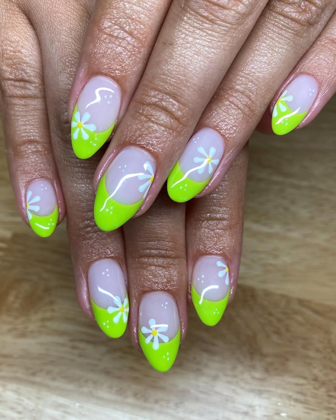 This set softens the neon trend with a sweet floral touch. Bright lime French tips sit on a milky nude base, while tiny white daisies add a cheerful spring vibe.