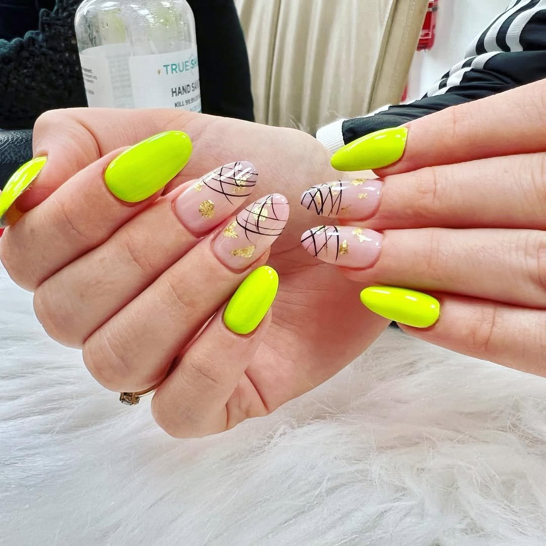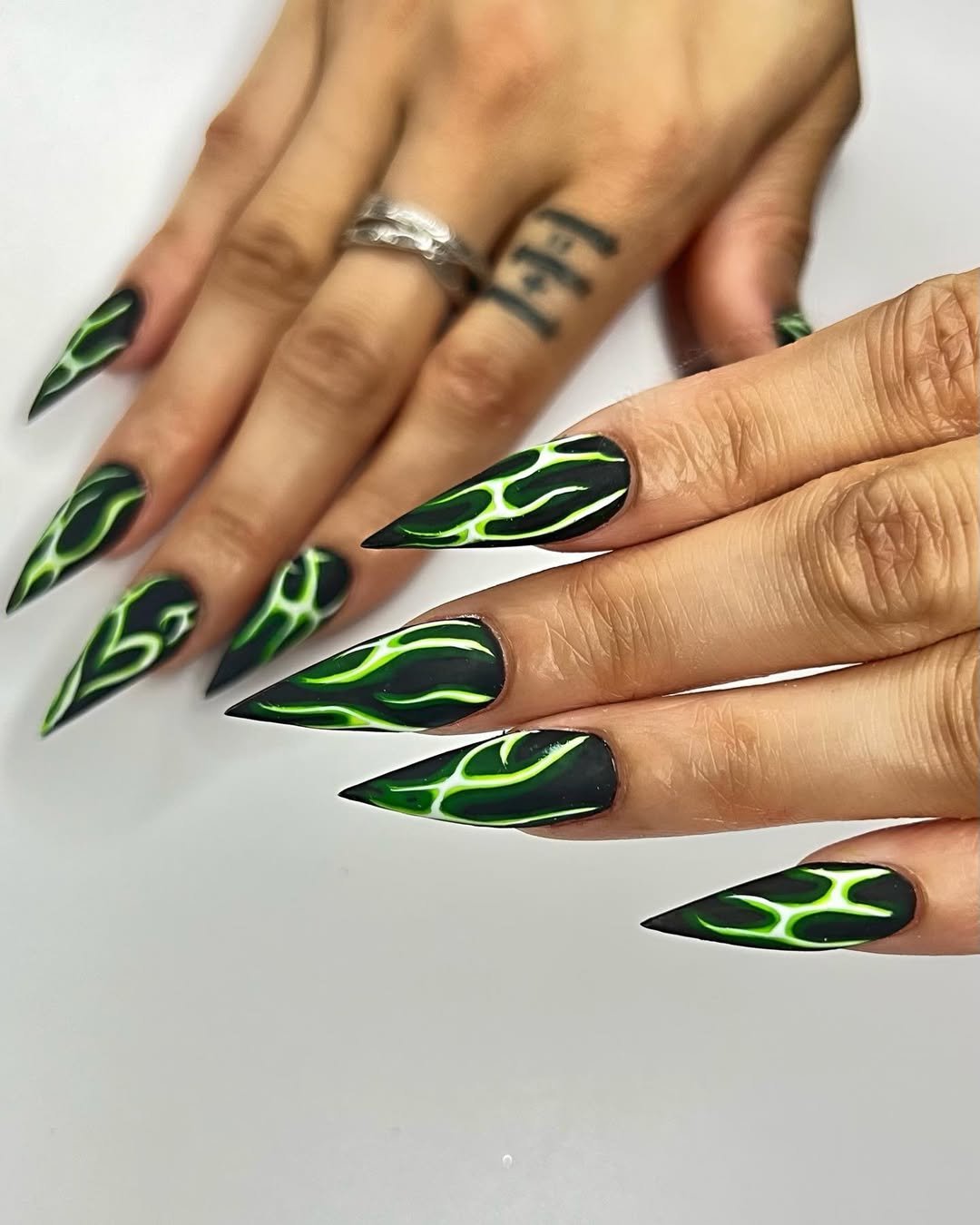 This set turns neon green into something sleek and edgy. Glossy black nails are layered with sharp lime flame-like lines that run across the surface like glowing electricity.