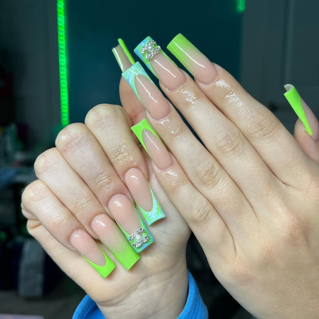 These nails take the classic French tip and crank up the brightness. Neon green tips fade into a soft nude base, while subtle marble accents add movement and texture to the design.