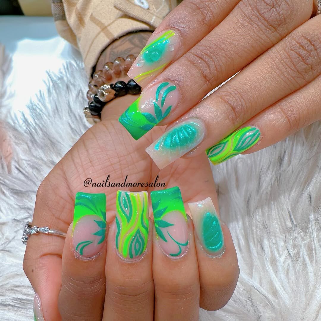These nails lean into abstract art with swirling neon greens, soft teal tones, and translucent bases that give the whole set a layered, modern feel.