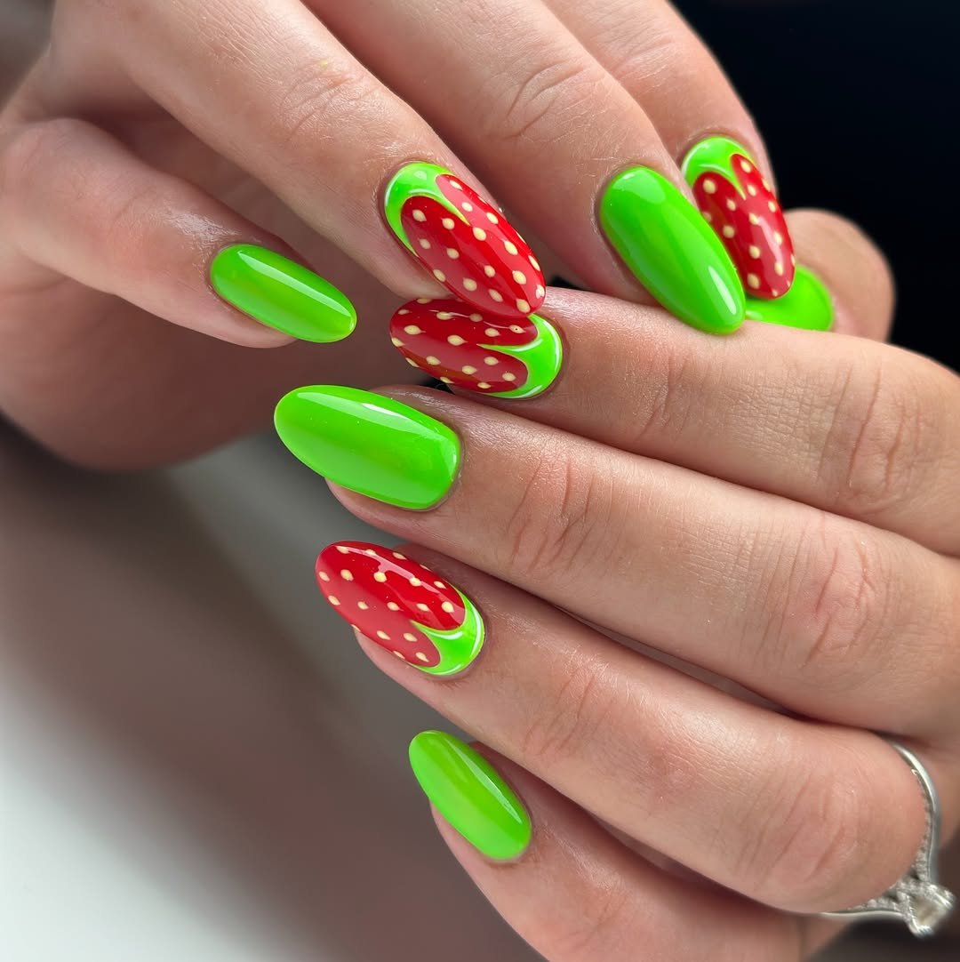 This manicure is basically summer fruit vibes in the cutest way possible. Bright neon green nails are paired with juicy strawberry-inspired accents that bring a fun splash of red and tiny seed details.