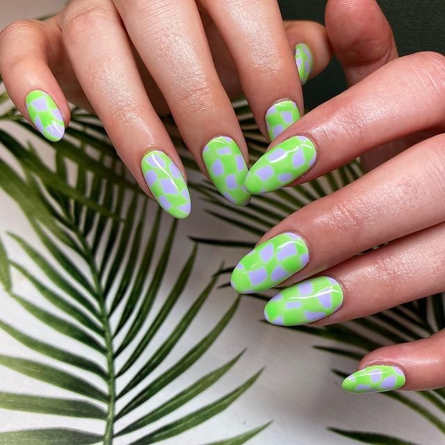 This set is basically summer energy in nail form. Neon green and soft lavender checks cover each nail, creating a playful pattern that instantly grabs attention without feeling too chaotic.