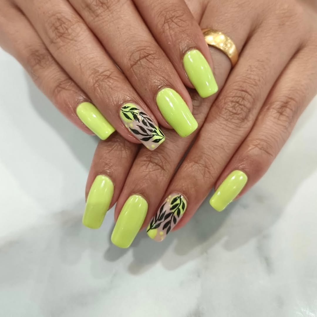 Sometimes all you need is a great color and one thoughtful detail. These soft lime green nails keep things clean and glossy, while a single accent nail with black leafy artwork adds just enough personality.