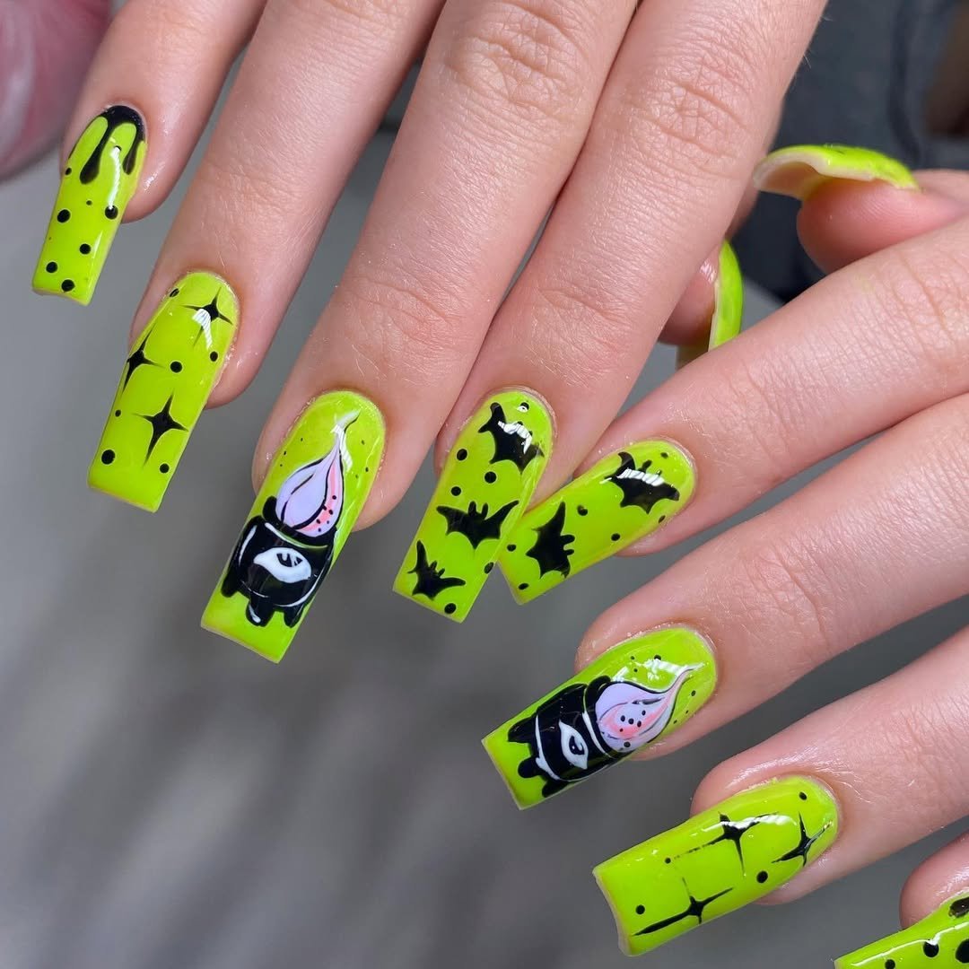 This set is playful with a little spooky edge. Bright lime green nails are covered in cartoon bats, sparkles, and fun character-style art that instantly gives the manicure personality.