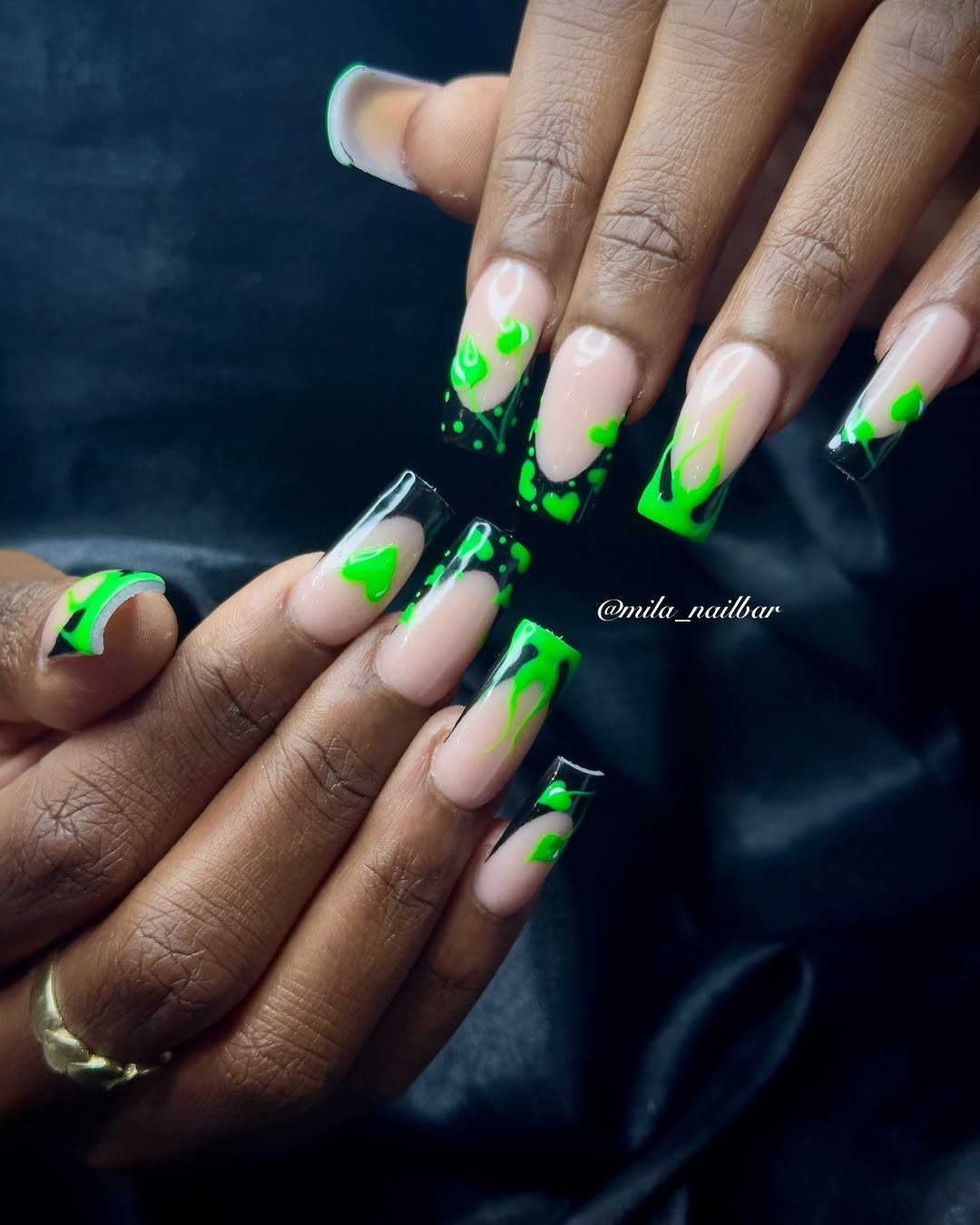 This manicure takes a playful twist with neon green drips flowing over a nude base. The glossy black accents and tiny heart details give the design a slightly edgy, slightly cute vibe.