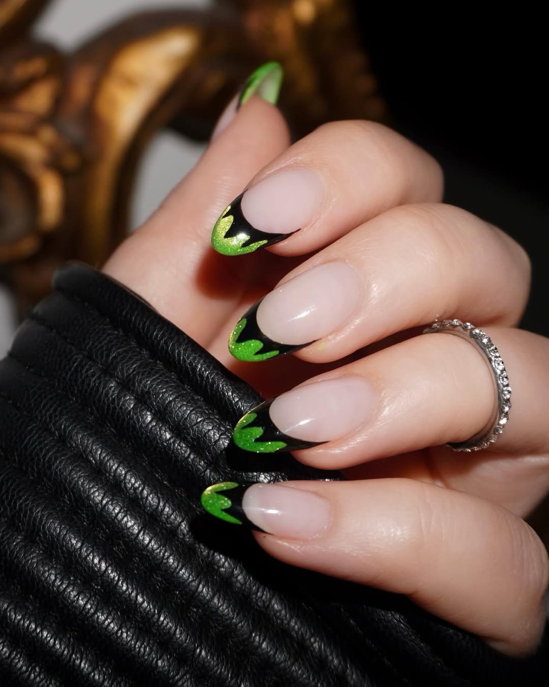 These nails mix black and neon green in a way that feels edgy but stylish. The French tips look like dripping paint, with glittery lime edges melting into glossy black.