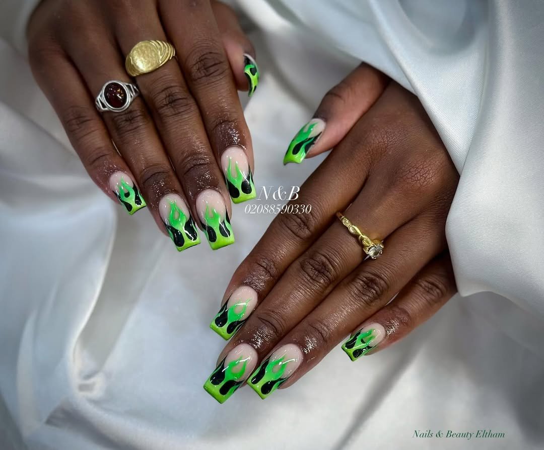 This set mixes soft nude bases with vibrant neon green flames climbing up the tips. The contrast between the natural base and those electric flames makes the whole design feel dynamic.