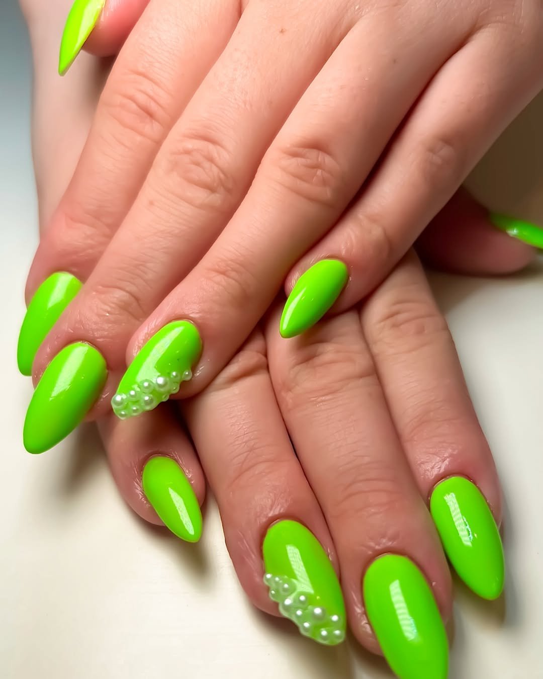 Bright neon green polish already makes a statement, but the delicate pearl accents on a couple of nails add a surprisingly elegant twist.