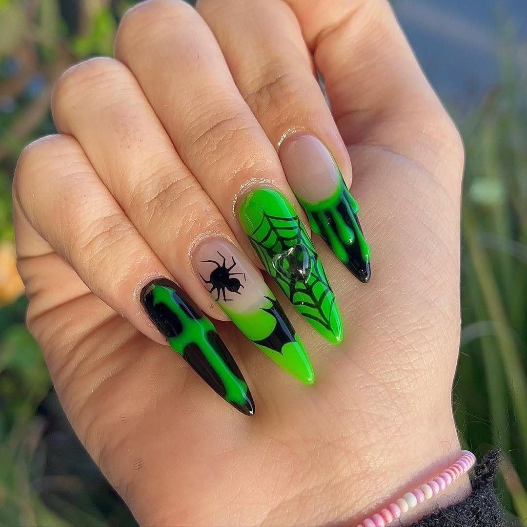 These nails look like Halloween decided to go neon. Bright slime-green polish drips over glossy black tips, while a spider web design and tiny spider detail bring the whole spooky vibe together.