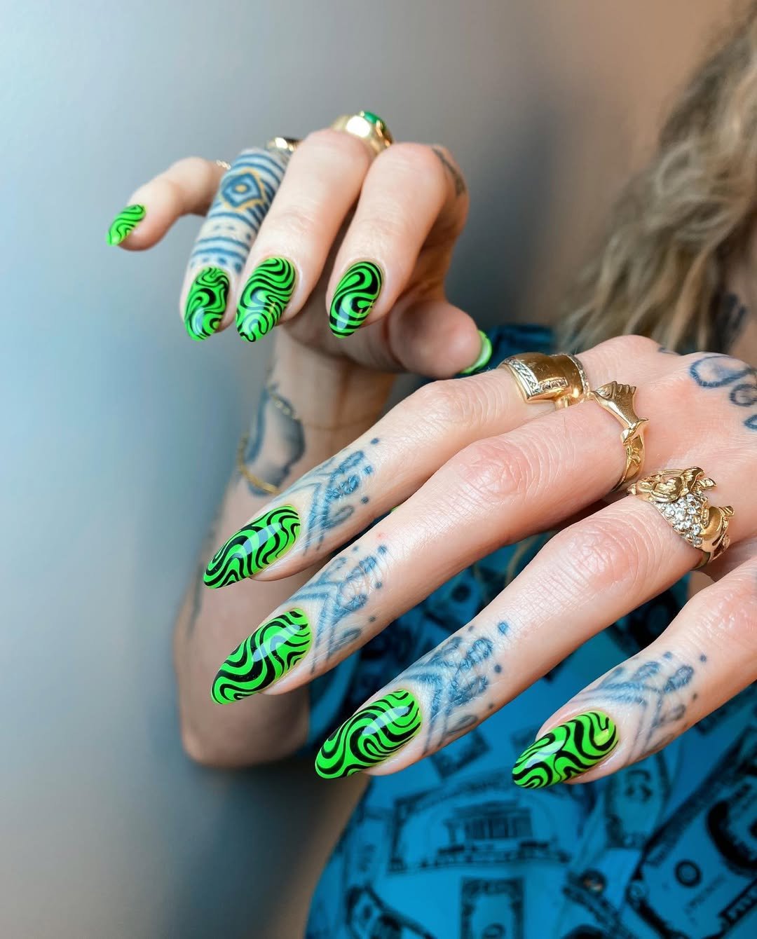 These nails bring serious retro energy. Bright neon green serves as the base while hypnotic black swirls twist across each nail like a mini lava lamp moment.