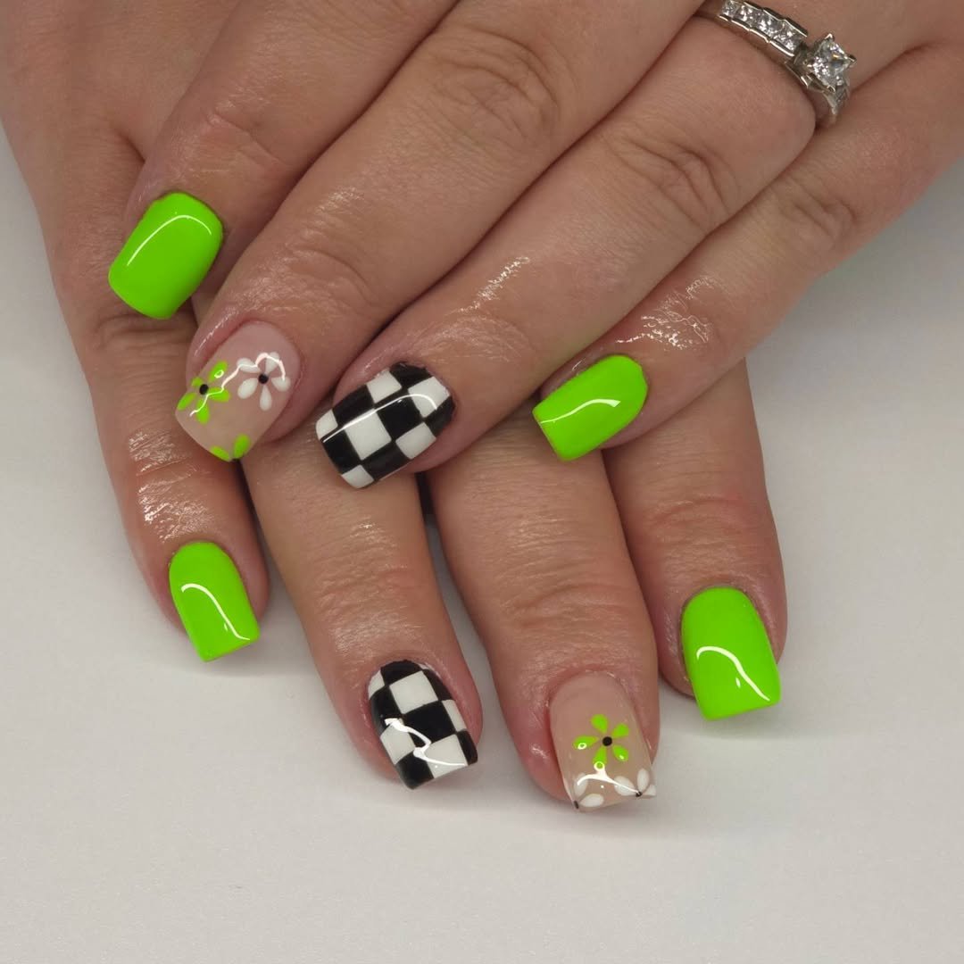 This manicure mixes a few fun elements together—bright neon green polish, a classic black-and-white checkerboard accent, and tiny floral details.