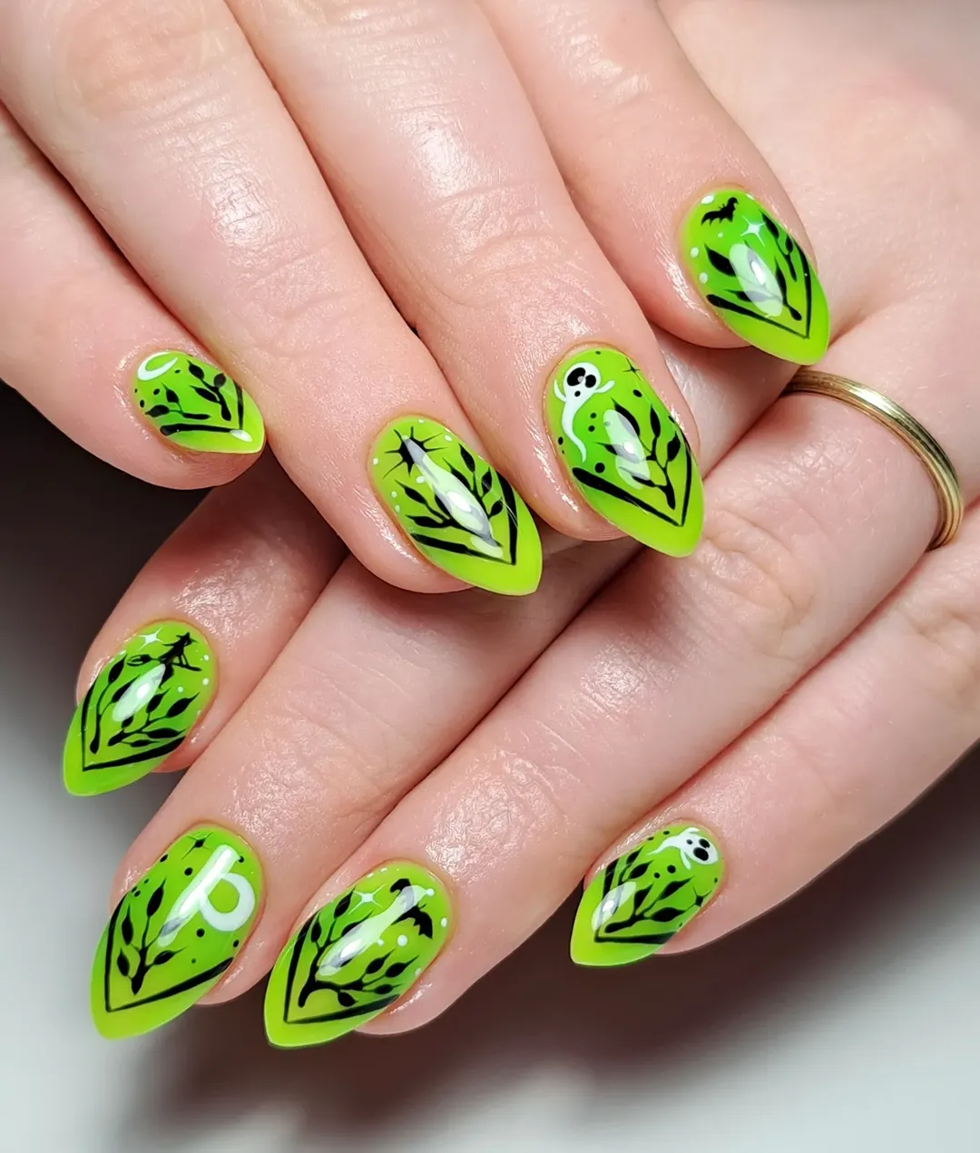 This manicure feels like a playful haunted garden. Neon green nails are decorated with delicate black branch-like patterns, tiny bats, and the cutest little ghost peeking through the design.