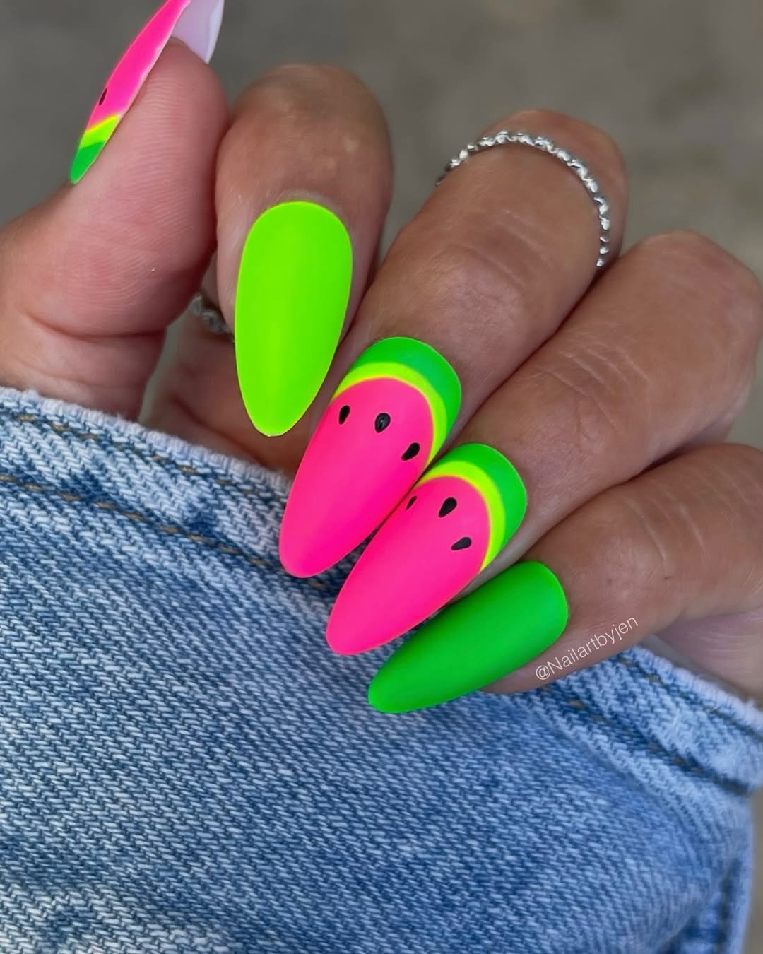 If summer had a mascot manicure, this might be it. Hot pink watermelon slices paired with neon green rind details bring a bright, juicy burst of color to these long almond nails.