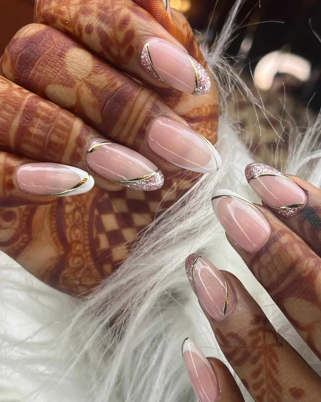 This one’s pure sophistication. The blush pink base paired with subtle white tips and gold accents creates a look that’s both traditional and modern — the best of both worlds.
