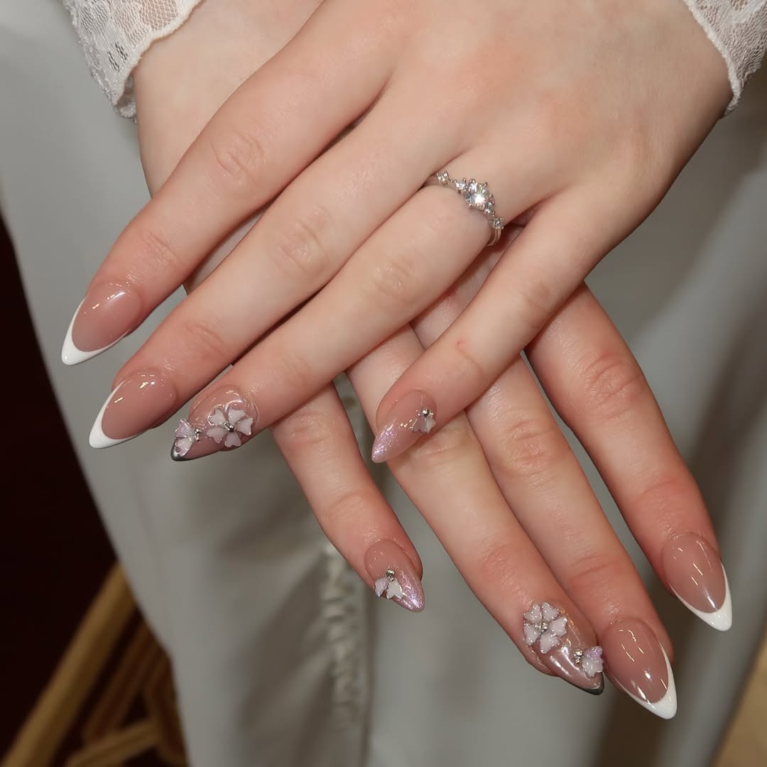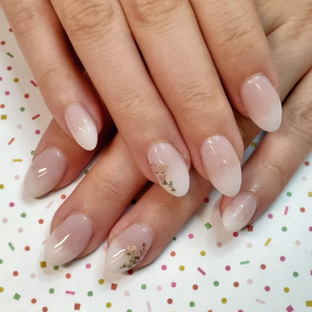 This mani is all about subtle romance. The gentle ombré from sheer nude to creamy white is effortlessly elegant, and those tiny floral decals? They’re the perfect touch of vintage charm. It’s giving “bridal morning sunlight through lace curtains.”