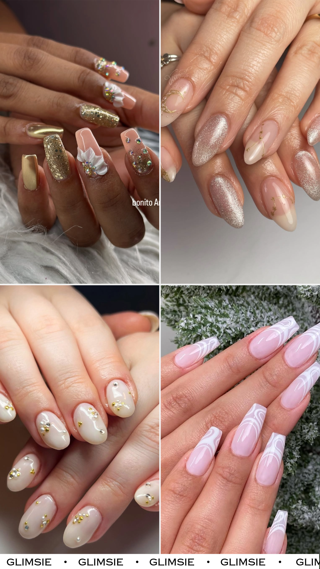 This set says main character energy. Between the gold chrome, glitter sparkle, and gem-studded accents, these nails bring serious “bridal afterparty” vibes. The combination of textures — glossy, metallic, and rhinestone — makes them feel ultra-luxurious.