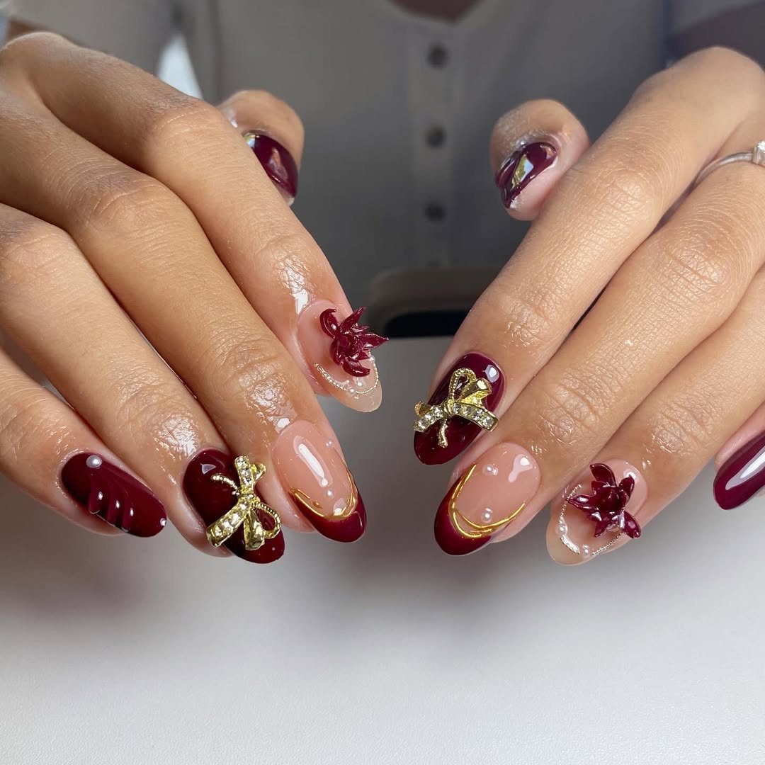 The 3D elements are the stars here — sculpted ribbons, tiny jewels, and that perfect balance of texture. It’s festive yet classy, a look that demands a second glance.