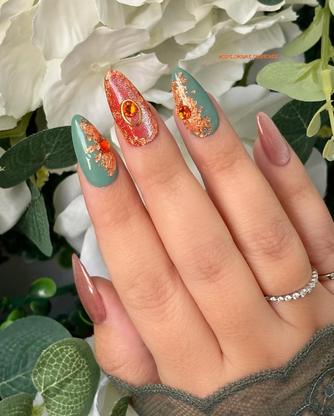 The leaf detailing and glitter gradients elevate the look without making it too much. Every element has intention — from the placement of the gems to the soft sparkle of the base.