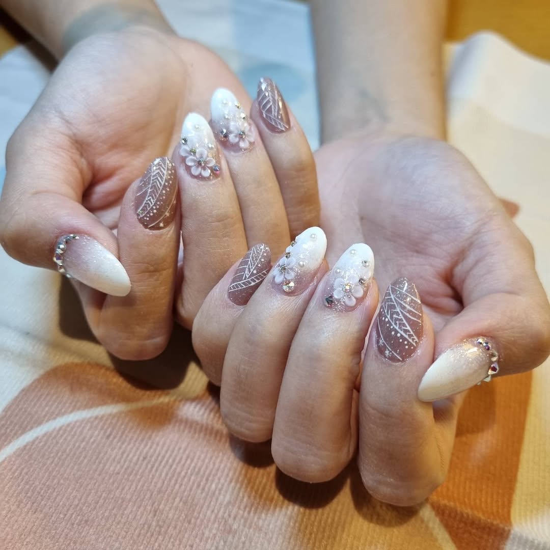 When bridal nails meet fairytale energy, you get this. Soft whites, shimmering overlays, and crystal flowers come together in a design that feels ethereal and regal all at once. It’s like frost-kissed petals frozen in time.