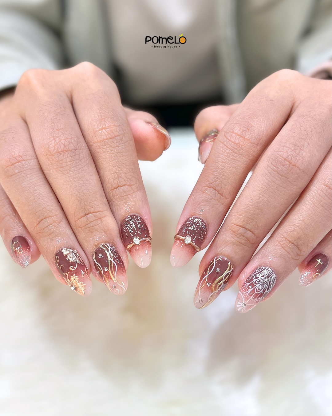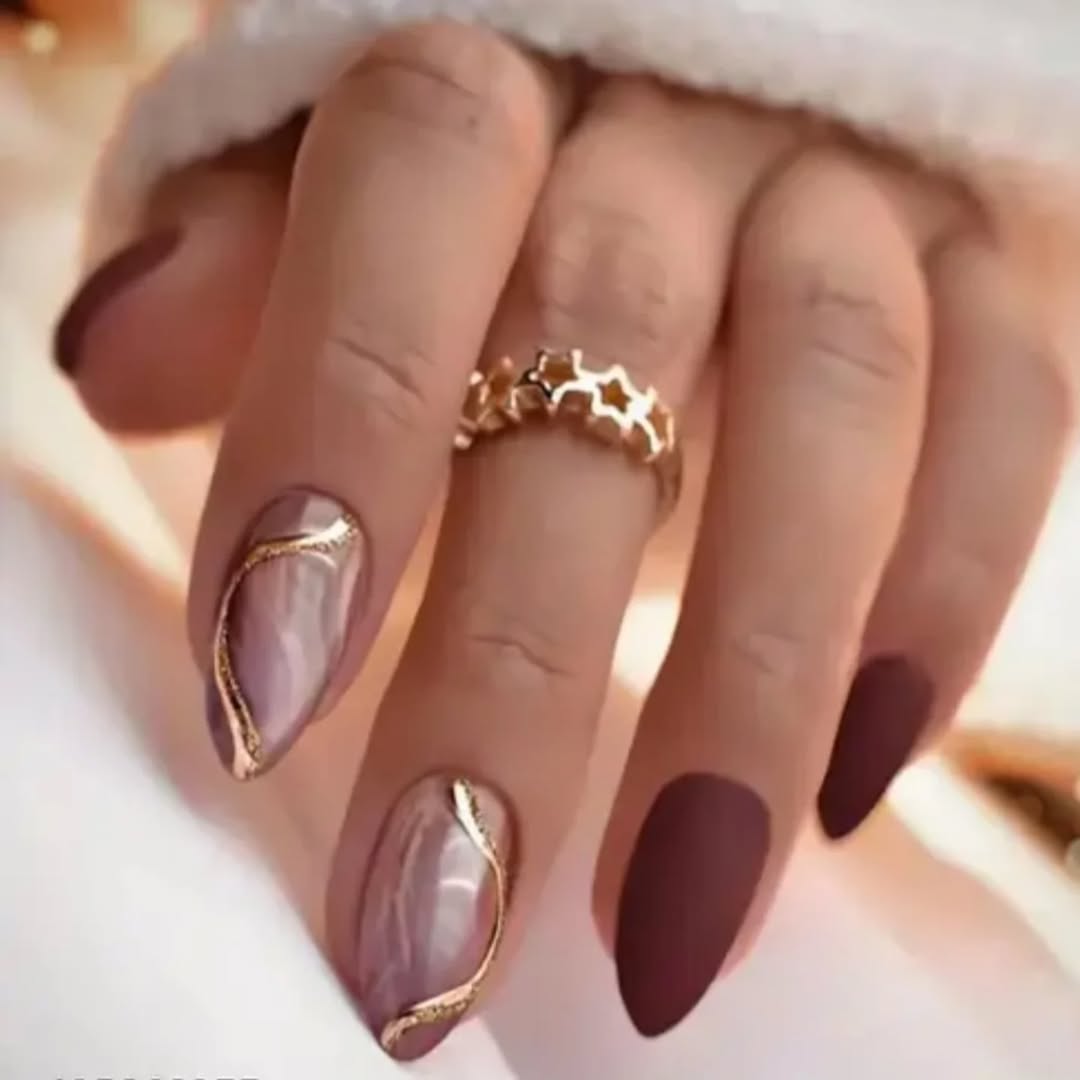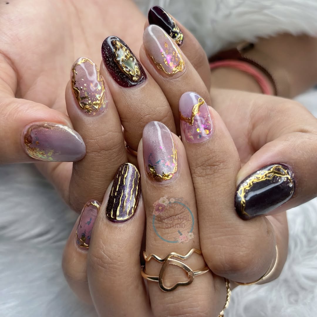 This one is pure luxury. Think marble textures, dreamy mauves, and rivers of molten gold running through each nail. The depth in the design makes it feel like something carved, not painted.