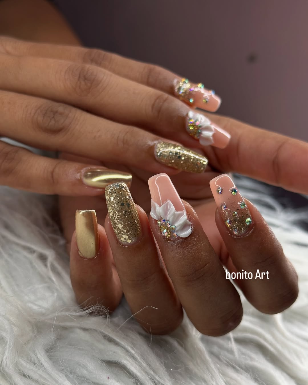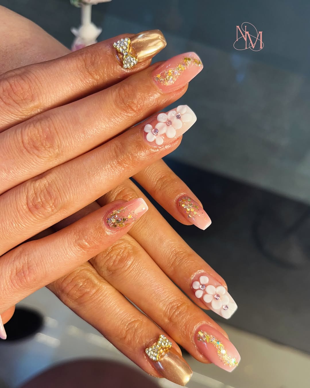 Those 3D flowers add dimension and romance, while the tiny sparkles scattered throughout give the nails a touch of enchantment. It’s glam, but in a “golden-hour glow” kind of way.