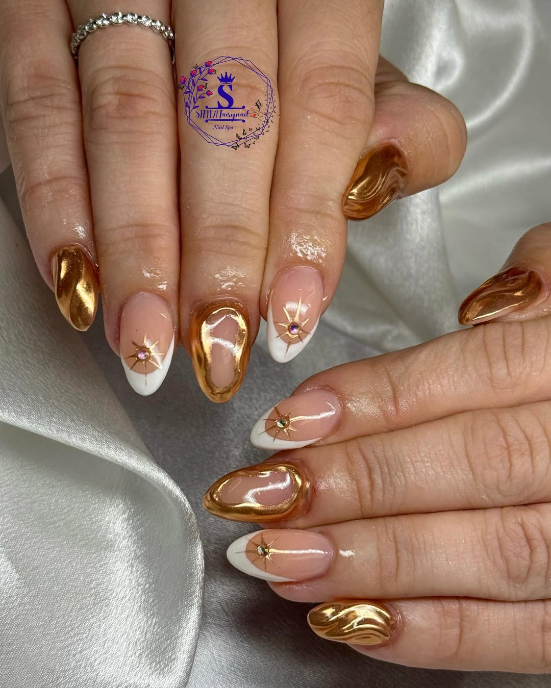 These nails are giving celestial goddess. White French tips meet molten gold swirls and tiny starburst gems — a heavenly combo that’s both bold and bridal.