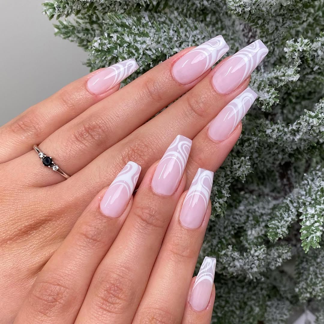 This design takes the classic French and gives it a cool-girl twist. The crisp white swirls over a soft blush base feel contemporary yet timeless. Clean lines, soft tones — it’s pure bridal magic with a modern spin.