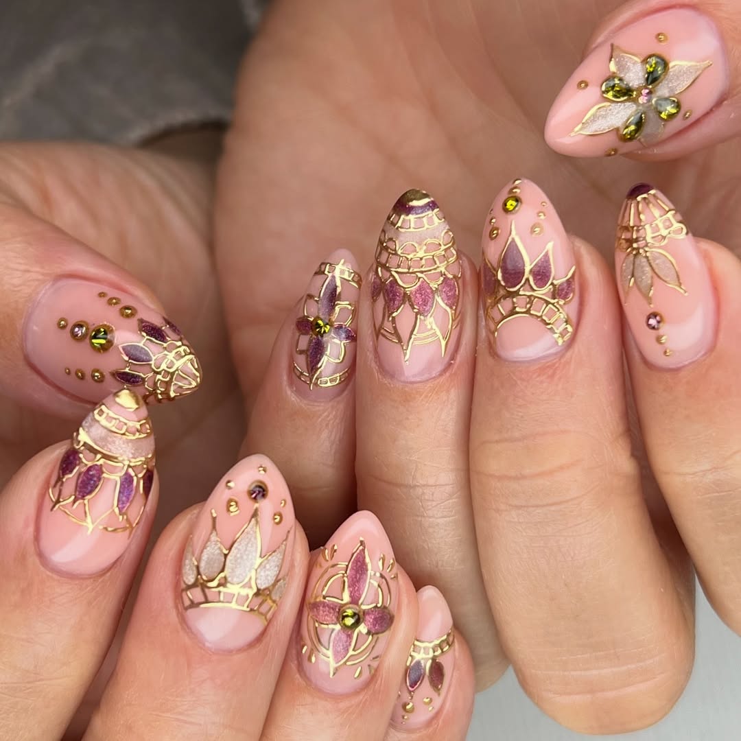 This look is luxury personified. Intricate gold filigree patterns intertwined with soft plum and ivory tones create a stunning, royal vibe. Every nail feels like a miniature stained-glass window.
