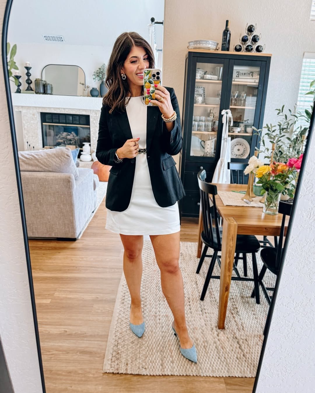 A crisp white mini dress under a tailored black blazer is such a power combo. Clean, sharp, and balanced. The pointed heels add that extra bit of intention—like, this isn’t just a throw-on look, it’s styled.