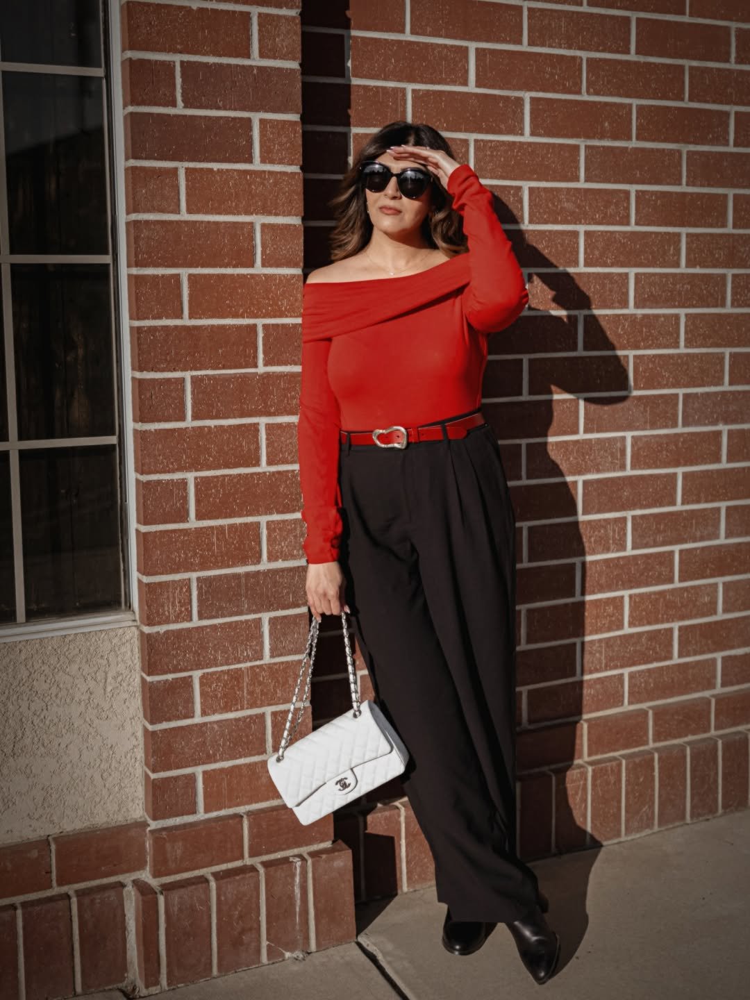 That off-the-shoulder red top against the brick wall? Instant power move. Paired with high-waisted black trousers and a matching red belt, it’s giving confident, pulled-together, and not afraid of a little drama.