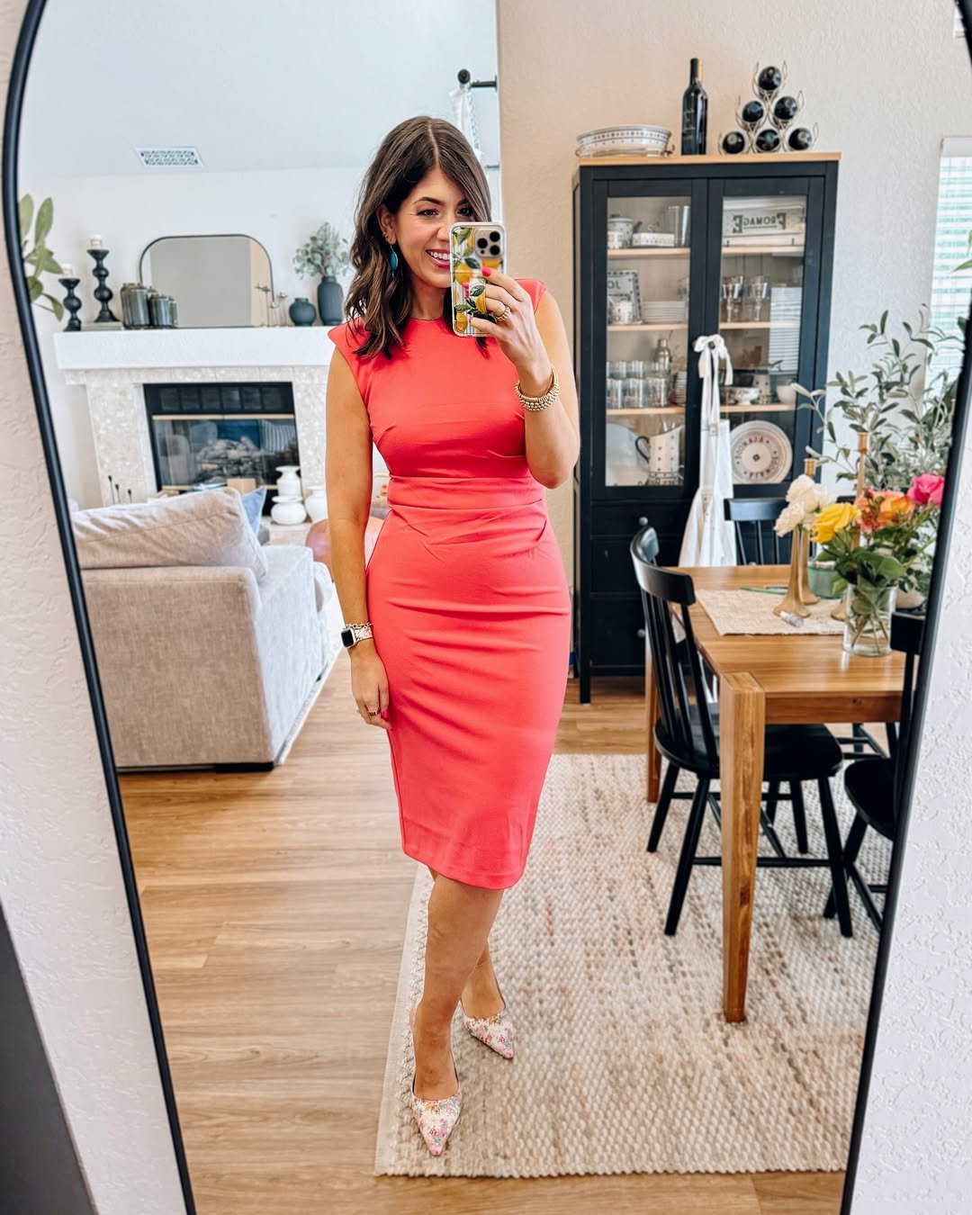 This fitted coral dress is pure confidence. The silhouette is sleek, the color is vibrant, and it hugs just enough to feel strong without being over the top.