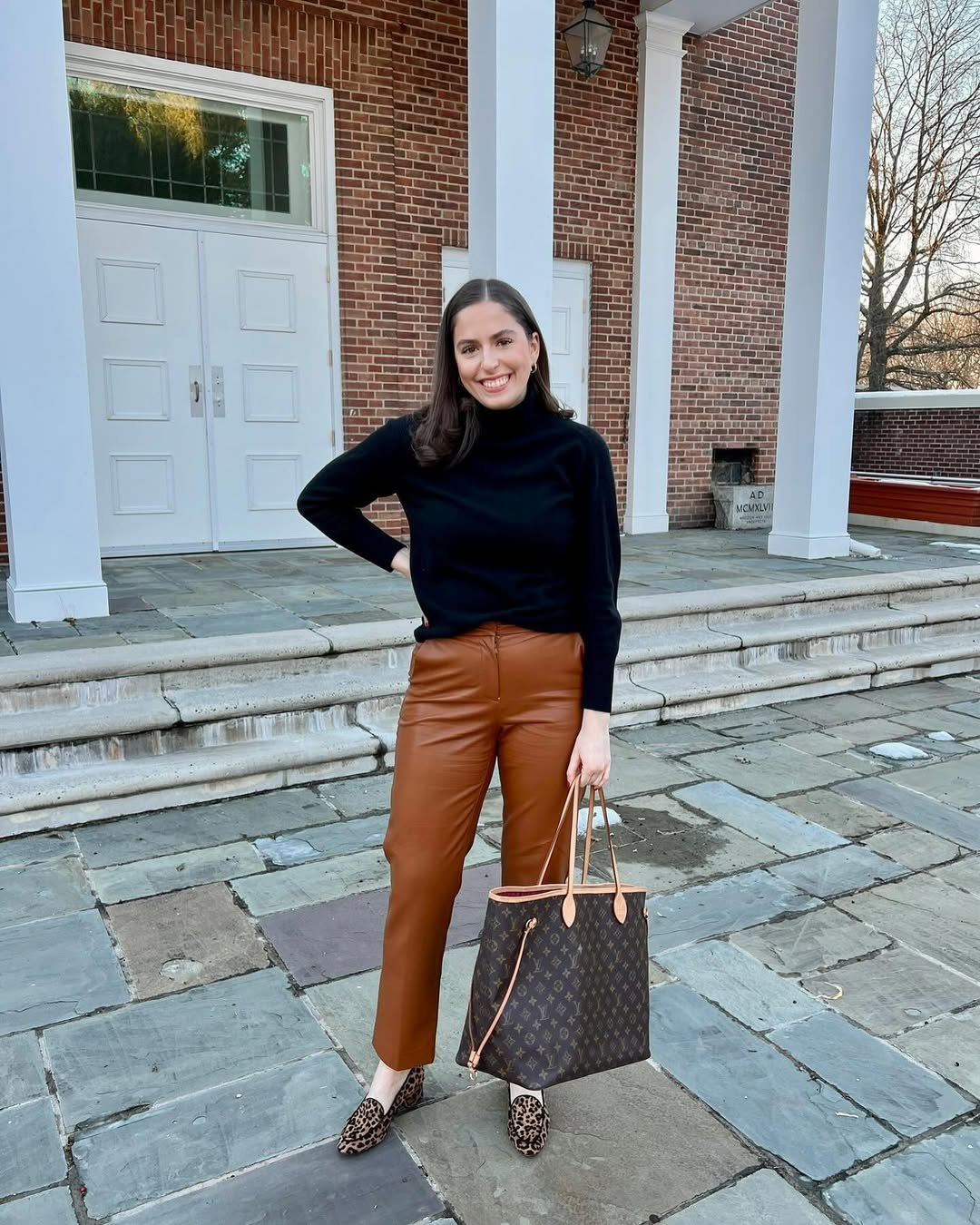 A black turtleneck tucked into sleek brown leather pants is timeless—but still interesting. The proportions are clean, and the loafers keep it grounded.