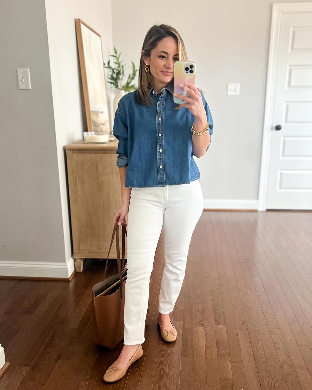 A cropped chambray shirt with white straight-leg pants is such a fresh spring reset. Clean lines, light colors, and neutral flats keep it office-friendly without overcomplicating things.
