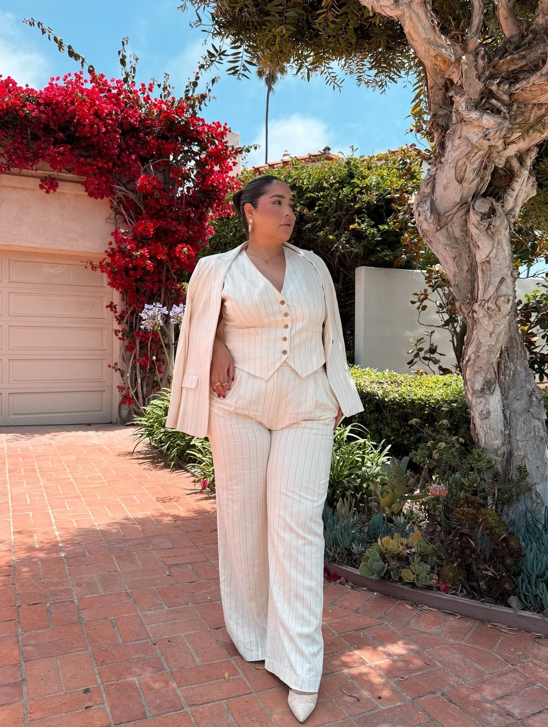 A cream pinstriped vest and matching trousers layered with a blazer draped over the shoulders feels tailored and fresh. It’s a nod to classic suiting—but with lighter fabric and softer lines for spring.