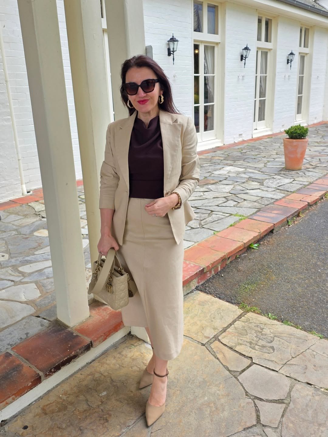 This beige skirt suit with the deep chocolate top underneath is such a masterclass in grown-woman polish. The silhouette is clean, the tones are rich, and those pointed nude heels elongate everything.