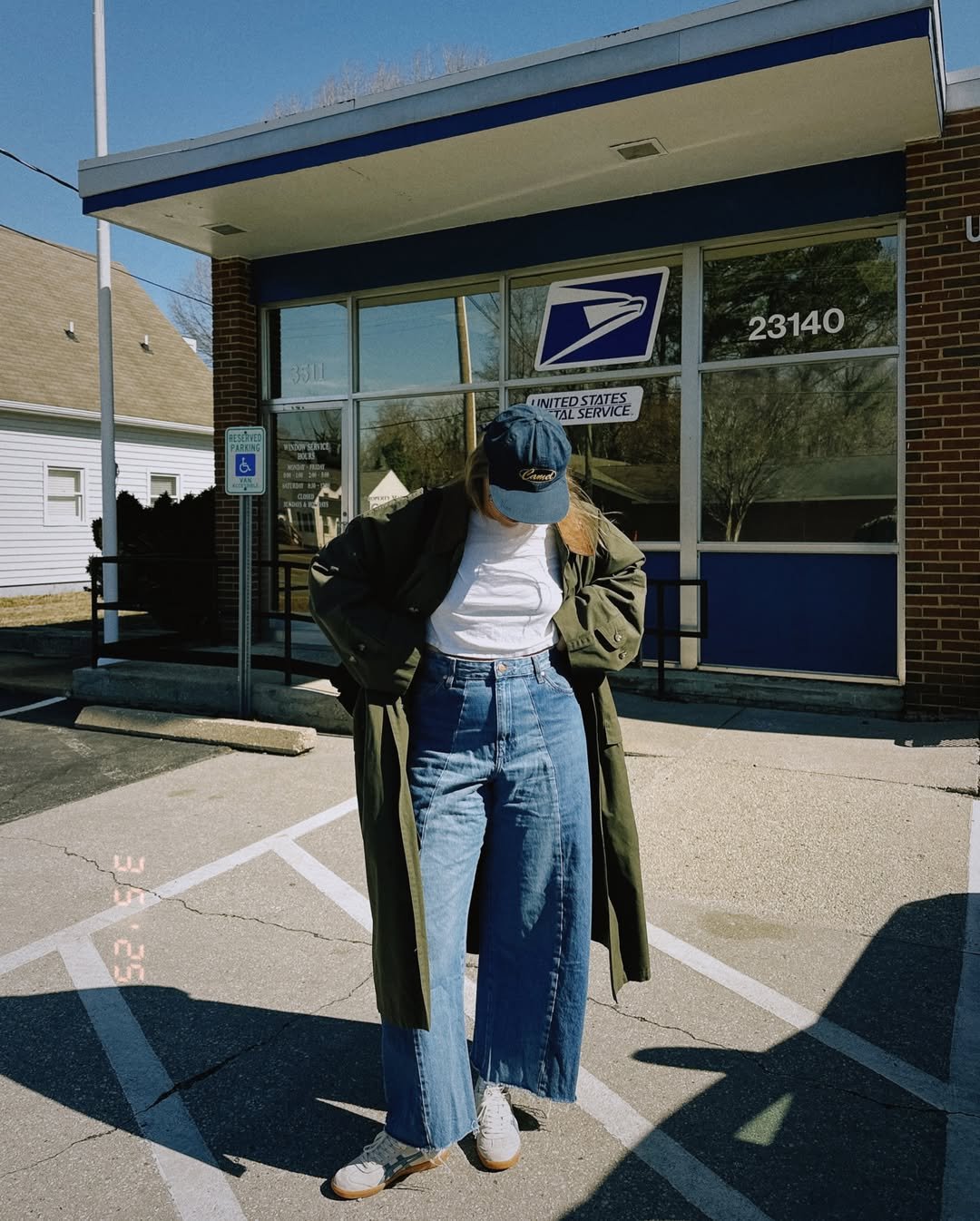 Wide-leg jeans, a crisp white tee, and a long utility coat topped with a cap—this is casual Friday done right. It leans relaxed, but the tailored denim silhouette keeps it intentional.