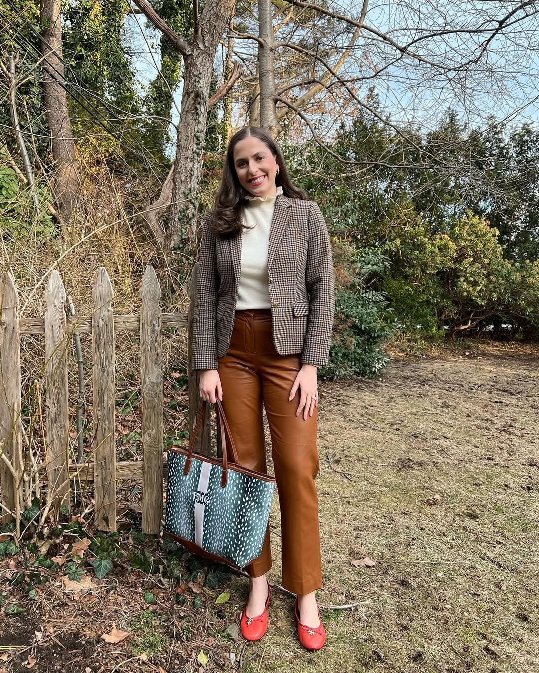 A houndstooth blazer with caramel leather trousers? Now that’s texture mixing done right. The red flats add personality without overpowering the look.