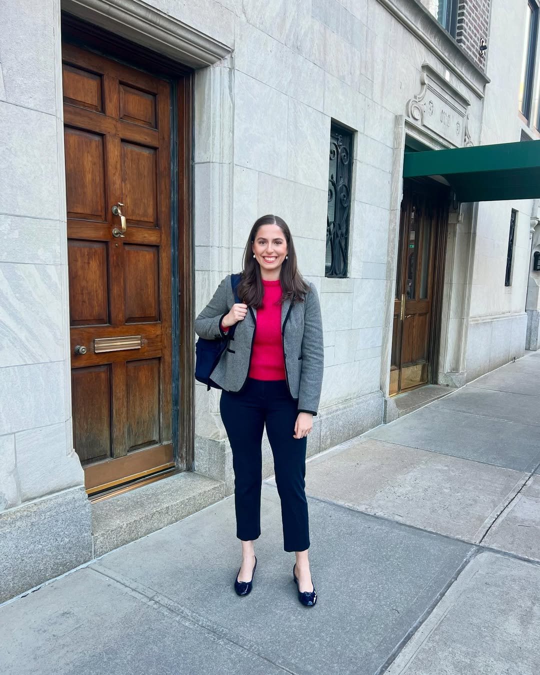 And those soft pink flats seal the deal. It’s the kind of outfit that feels Ivy League-adjacent but still approachable. Structured on top, a little fun at the bottom—exactly how you keep workwear from going stale.