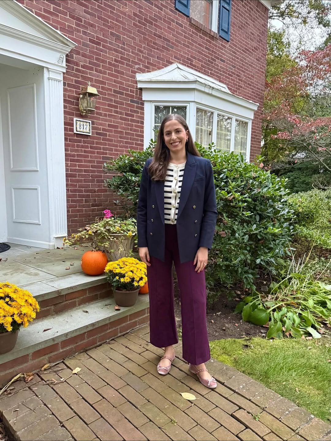 A navy double-breasted blazer over a striped knit is already a classic, but pairing it with those rich burgundy cropped trousers? That’s where it gets interesting. It’s polished, yes—but there’s a little playful contrast happening that keeps it from feeling too predictable.