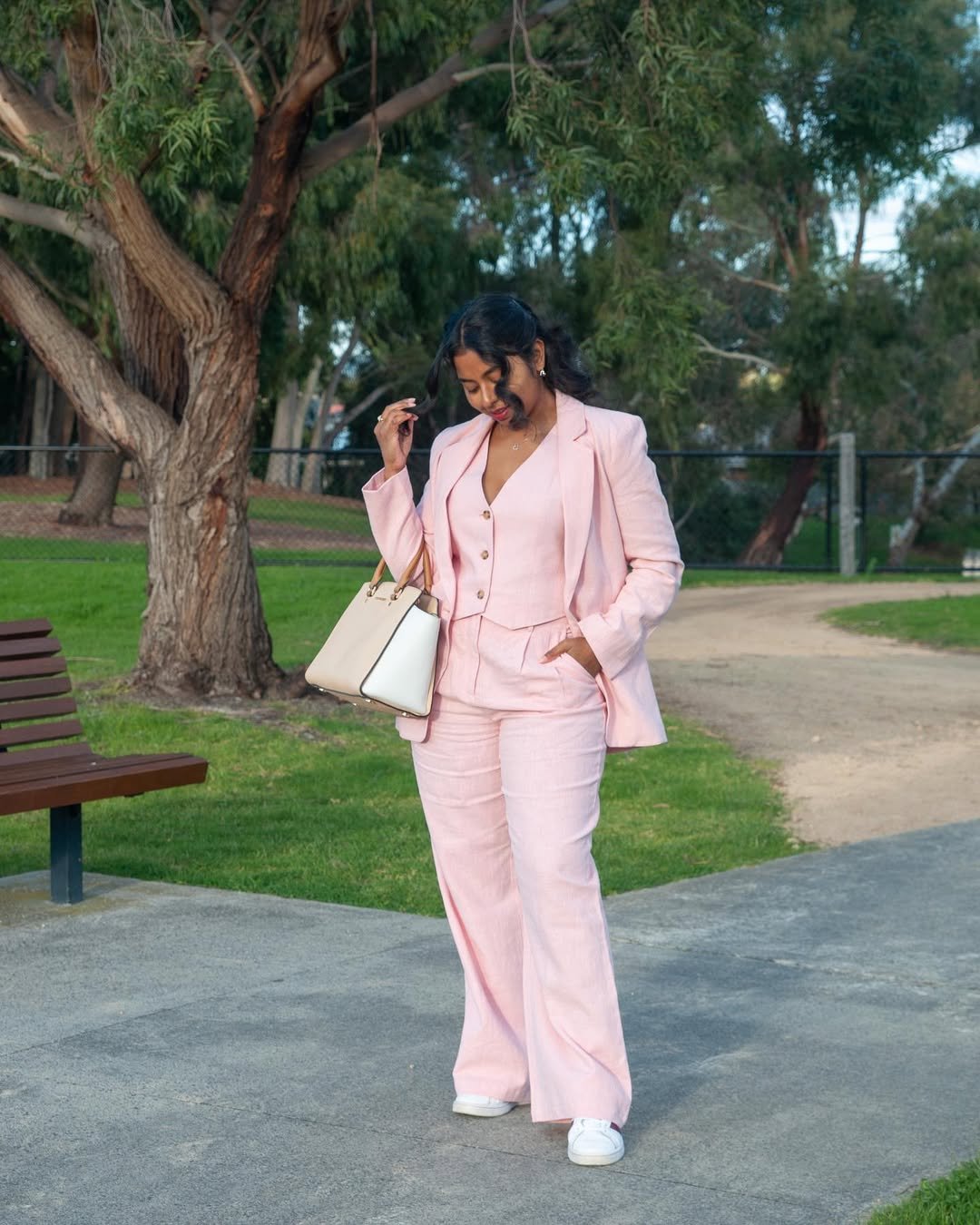 It feels polished but breathable—like you’re ready for meetings and rooftop lunch breaks. Proof that soft colors can still mean serious business.