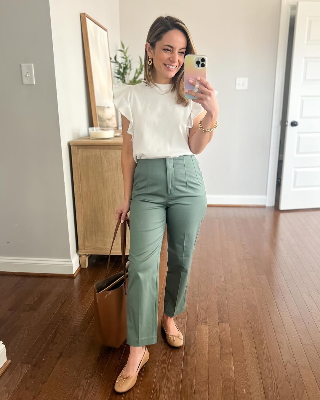 A flutter-sleeve ivory top tucked into tailored sage trousers? That’s the kind of subtle spring color pop that feels elevated but wearable.