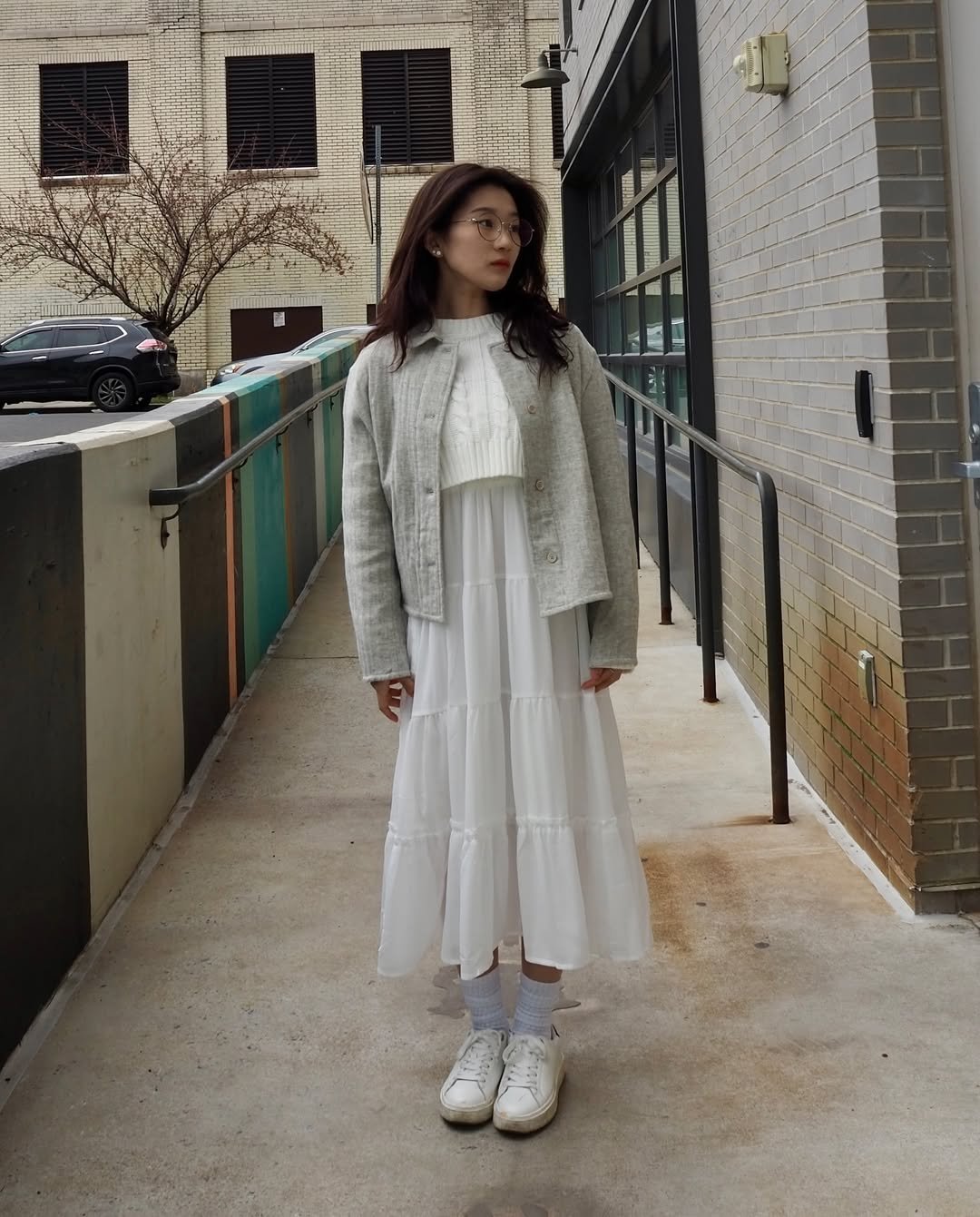 A tiered white dress layered under a cropped knit and topped with a light jacket? This is quiet luxury meets cozy café afternoon. The sneakers keep it grounded and wearable.