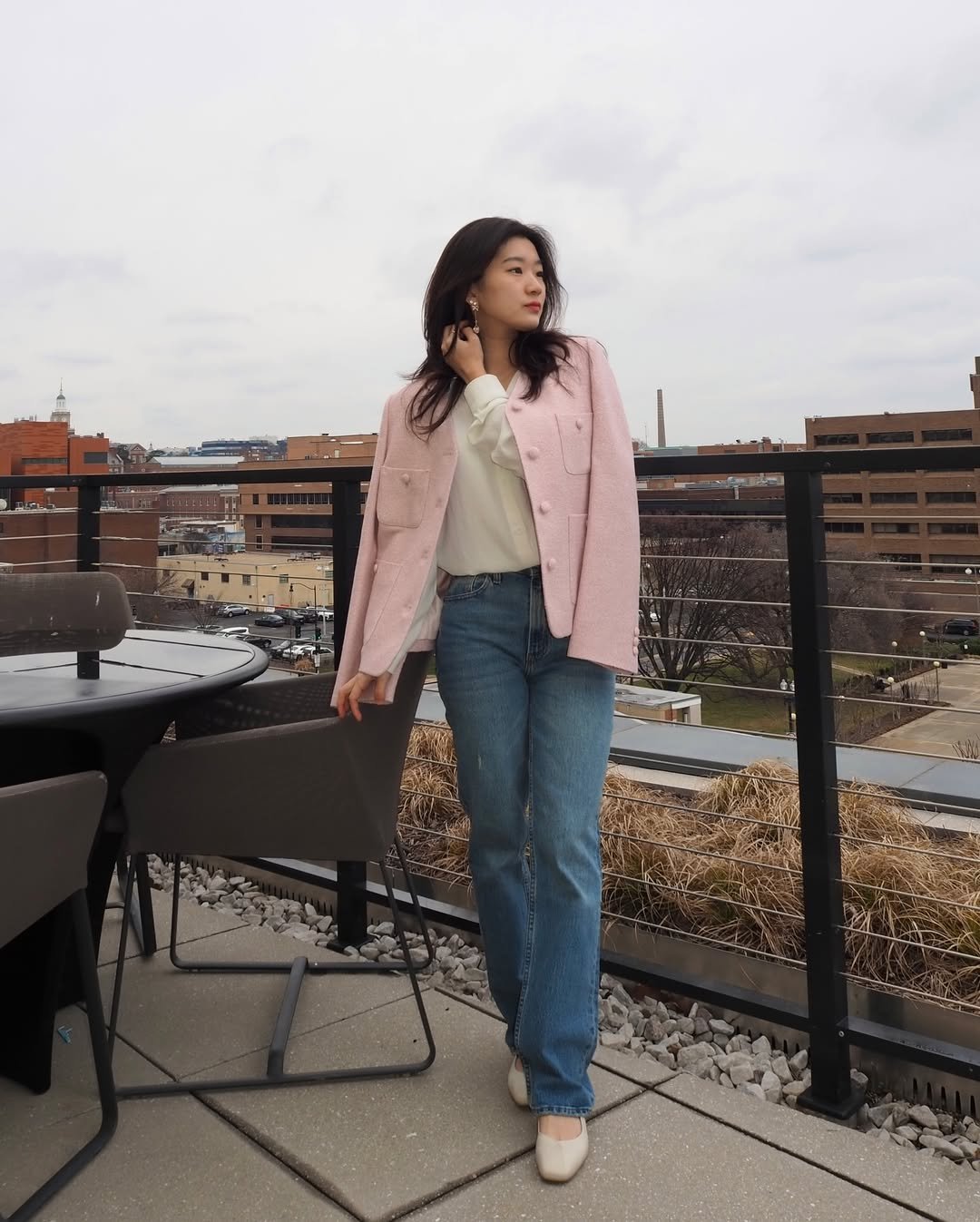 A blush-toned blazer over a creamy blouse and classic blue jeans? That’s how you do spring at the office without going full floral. The structured jacket keeps it boardroom-appropriate, while the denim relaxes the whole vibe just enough.