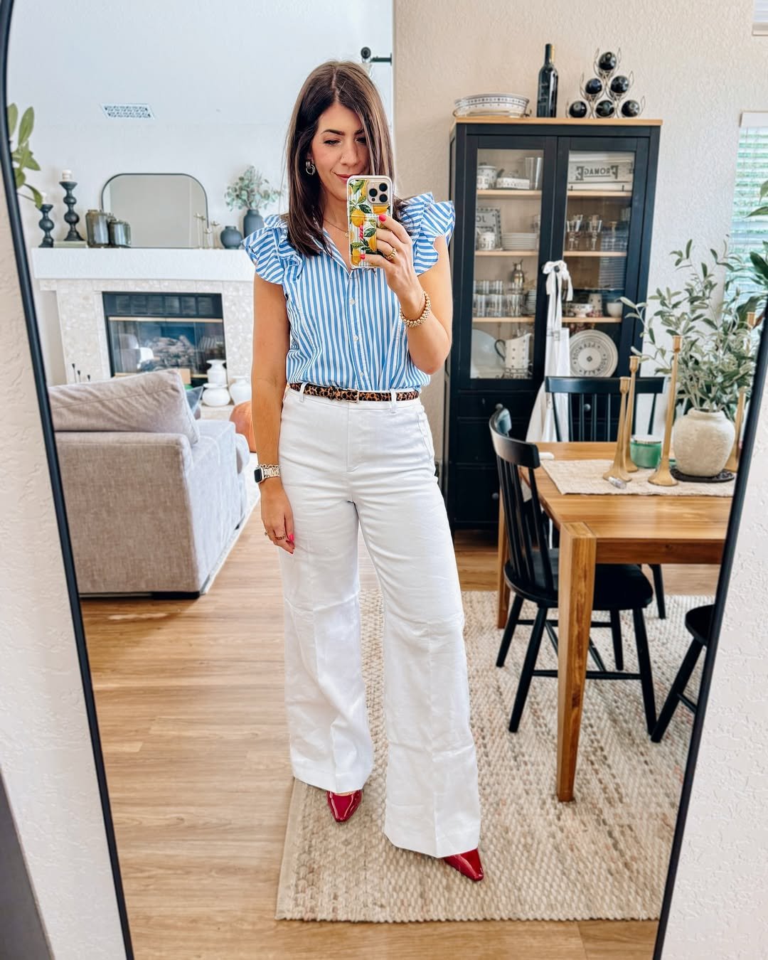 A blue striped blouse with white wide-leg trousers instantly feels spring-ready. Add a slim belt and bold red heels, and suddenly the whole outfit has personality.
