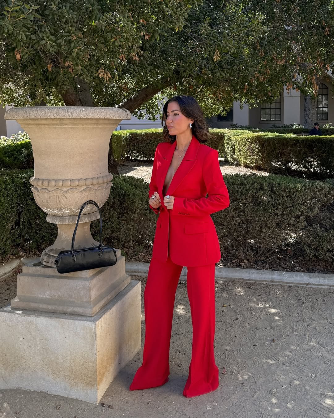 Nothing says confidence like a bold red suit. The sharp tailoring, deep neckline, and wide-leg trousers create a statement that doesn’t whisper—it walks in and owns the room.