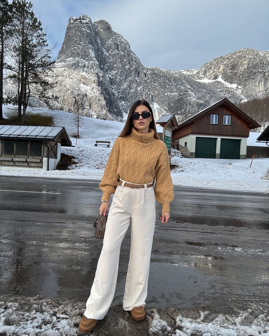 This look proves that cozy can still be chic. The chunky camel knit tucked into tailored cream trousers creates a beautiful balance between warmth and structure.
