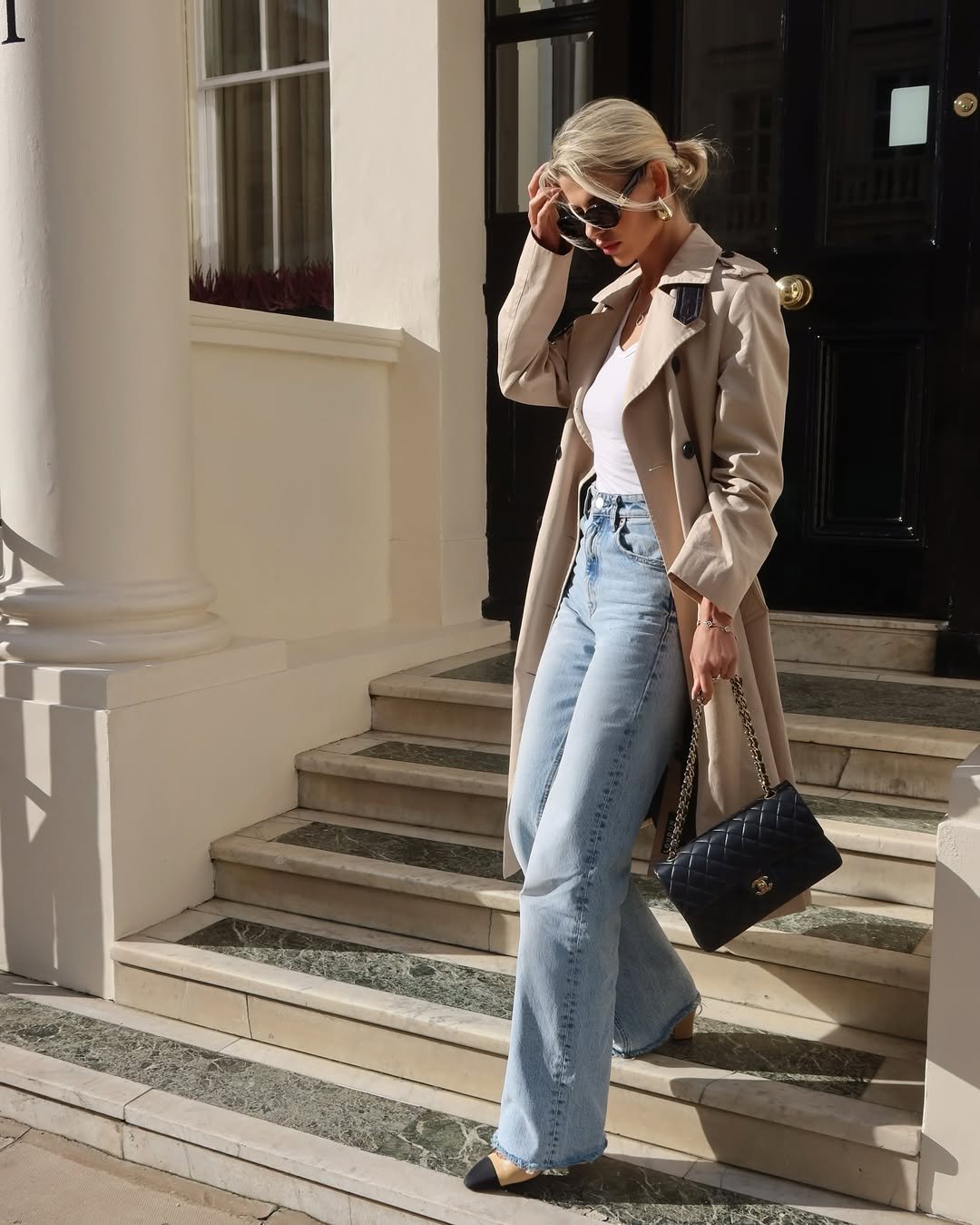 This is that go-to outfit that never fails. A beige trench layered over a white top and relaxed denim—it’s simple, but always looks right.
