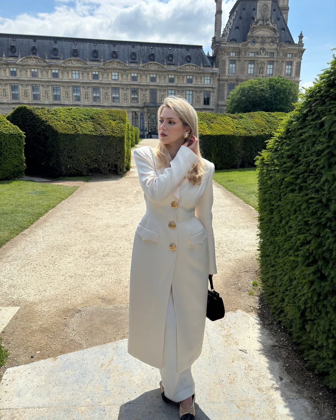 This look is pure sophistication. The long cream coat with gold buttons paired with matching trousers creates a monochrome moment that feels incredibly luxe.