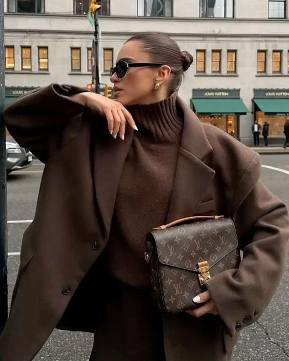 This look leans into rich, dark tones in the best way possible. The oversized brown coat layered over a matching knit set creates depth, warmth, and that ultra-luxurious feel.