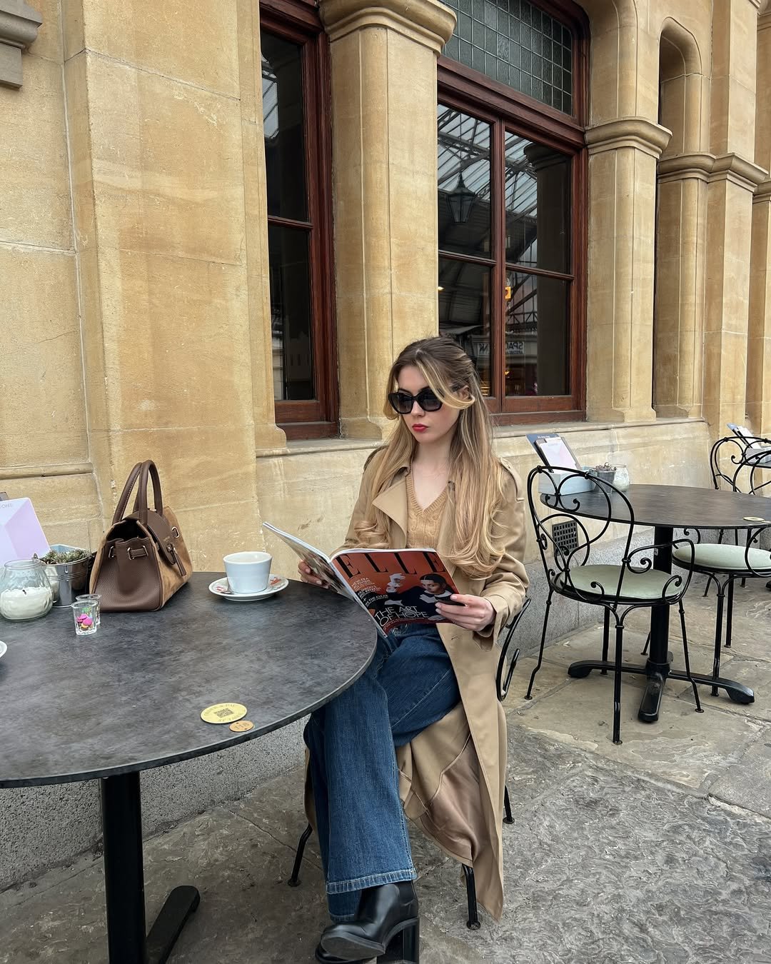 There’s something about a trench coat at a café that just works every single time. Paired with denim and a soft knit, this outfit leans into that cozy-yet-polished balance that always feels right.